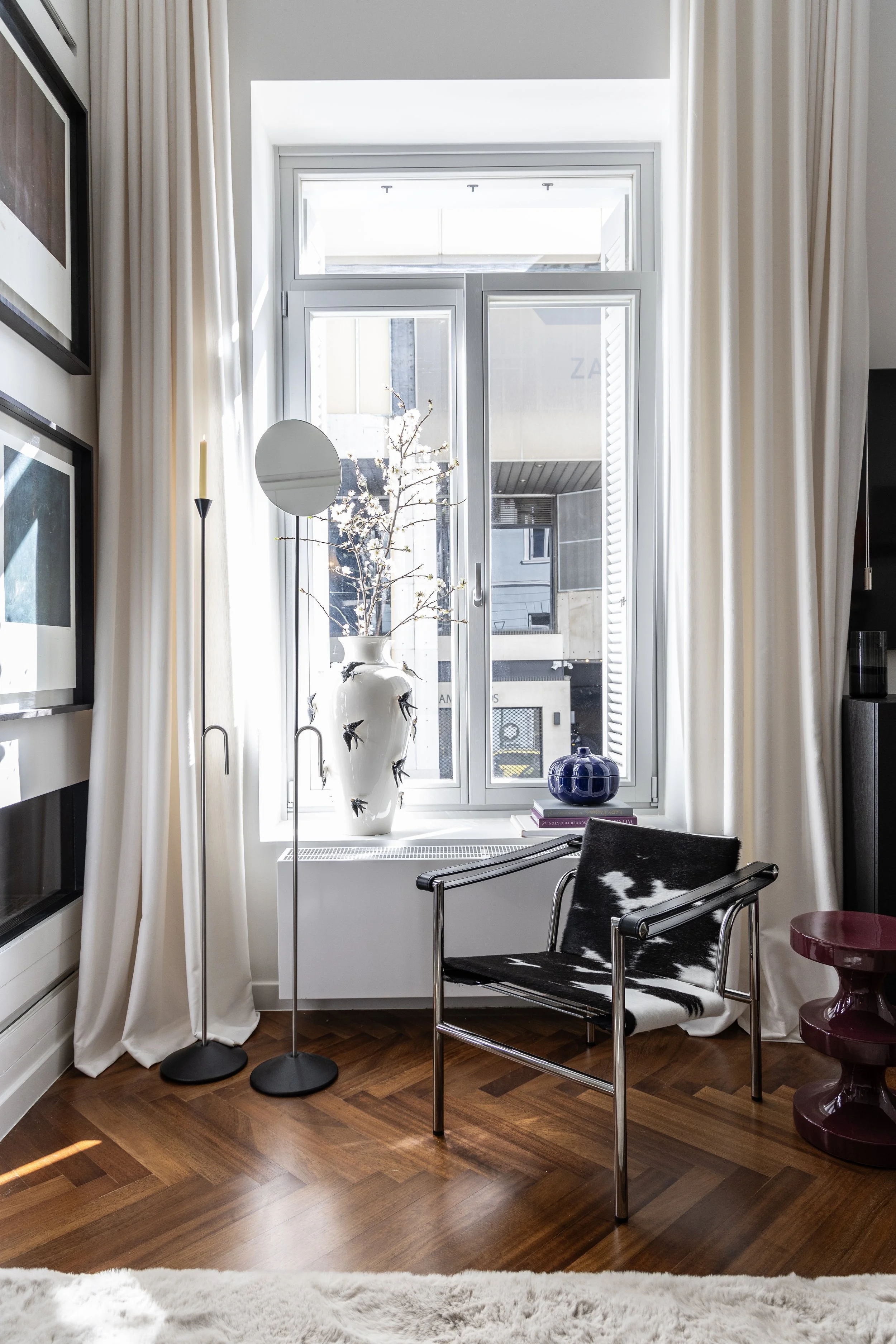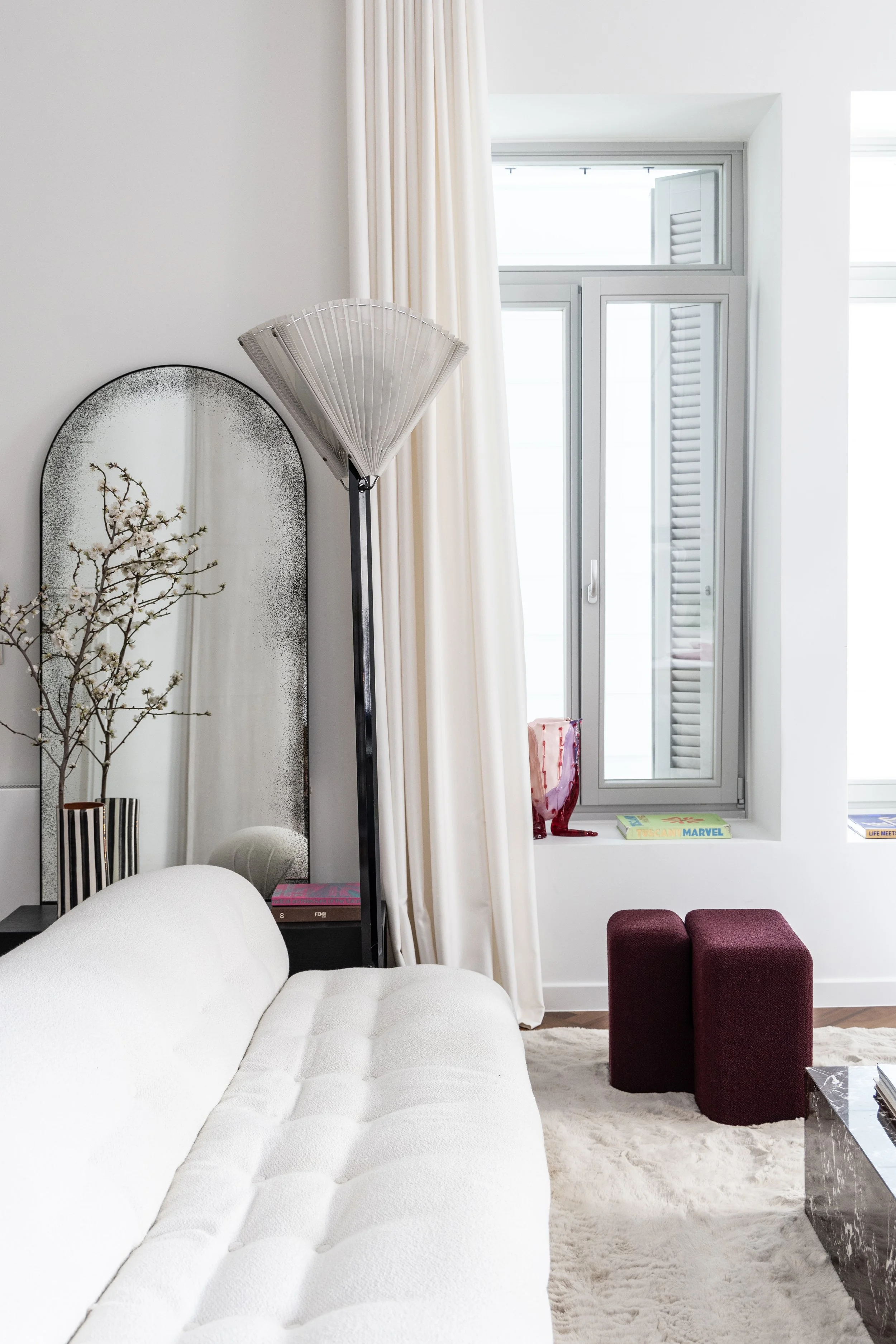 A refined blend of bold colors, luxurious materials, and modern design. High ceilings and flowing drapes enhance the openness, while oversized mirrors amplify light and space.