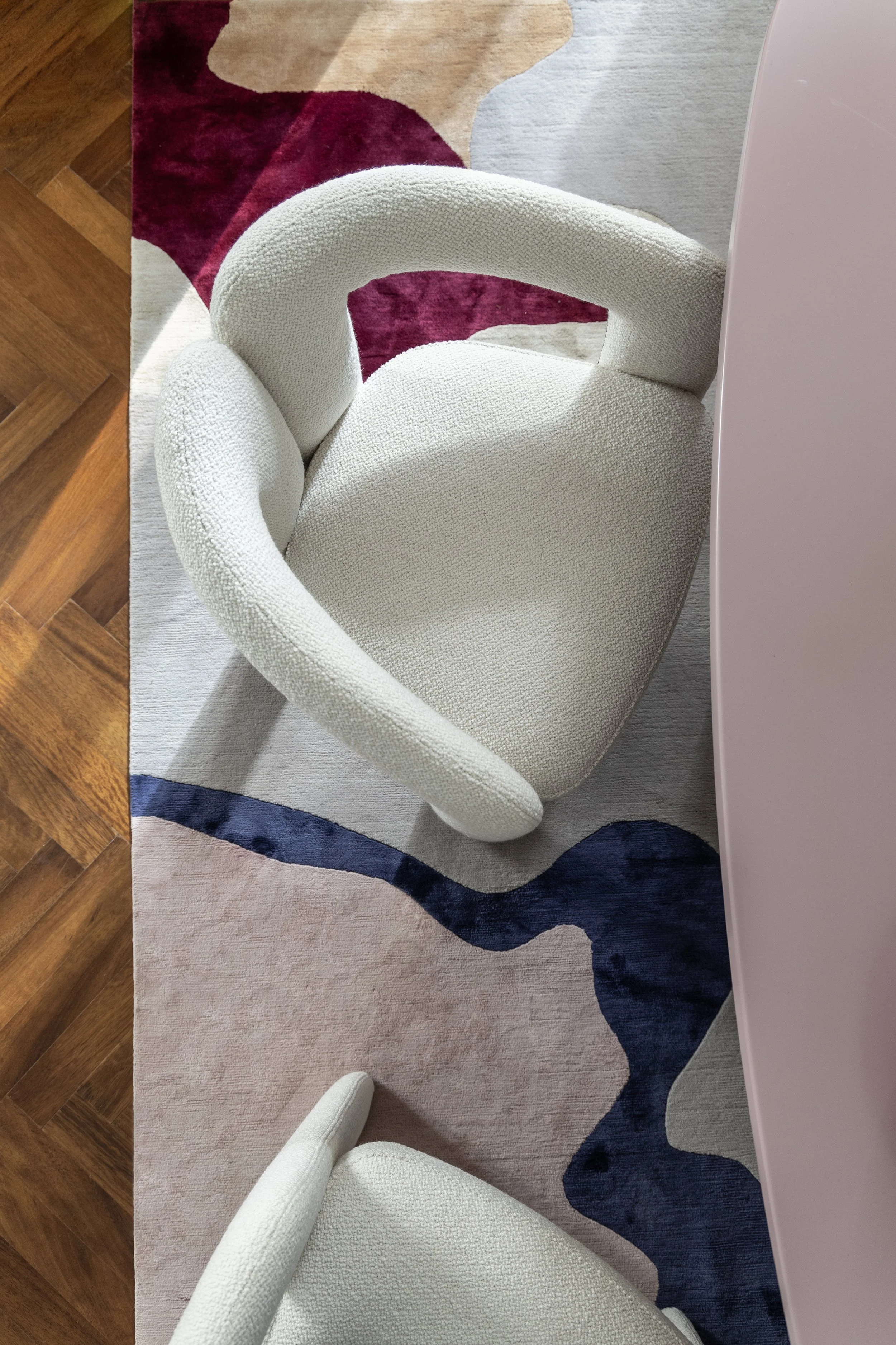 Curved bouclé seating, polished lacquered surfaces, and layered textures create a sophisticated yet inviting ambiance. Balancing architectural precision with warmth, this apartment redefines contemporary Athenian living with a timeless, expressive aesthetic.