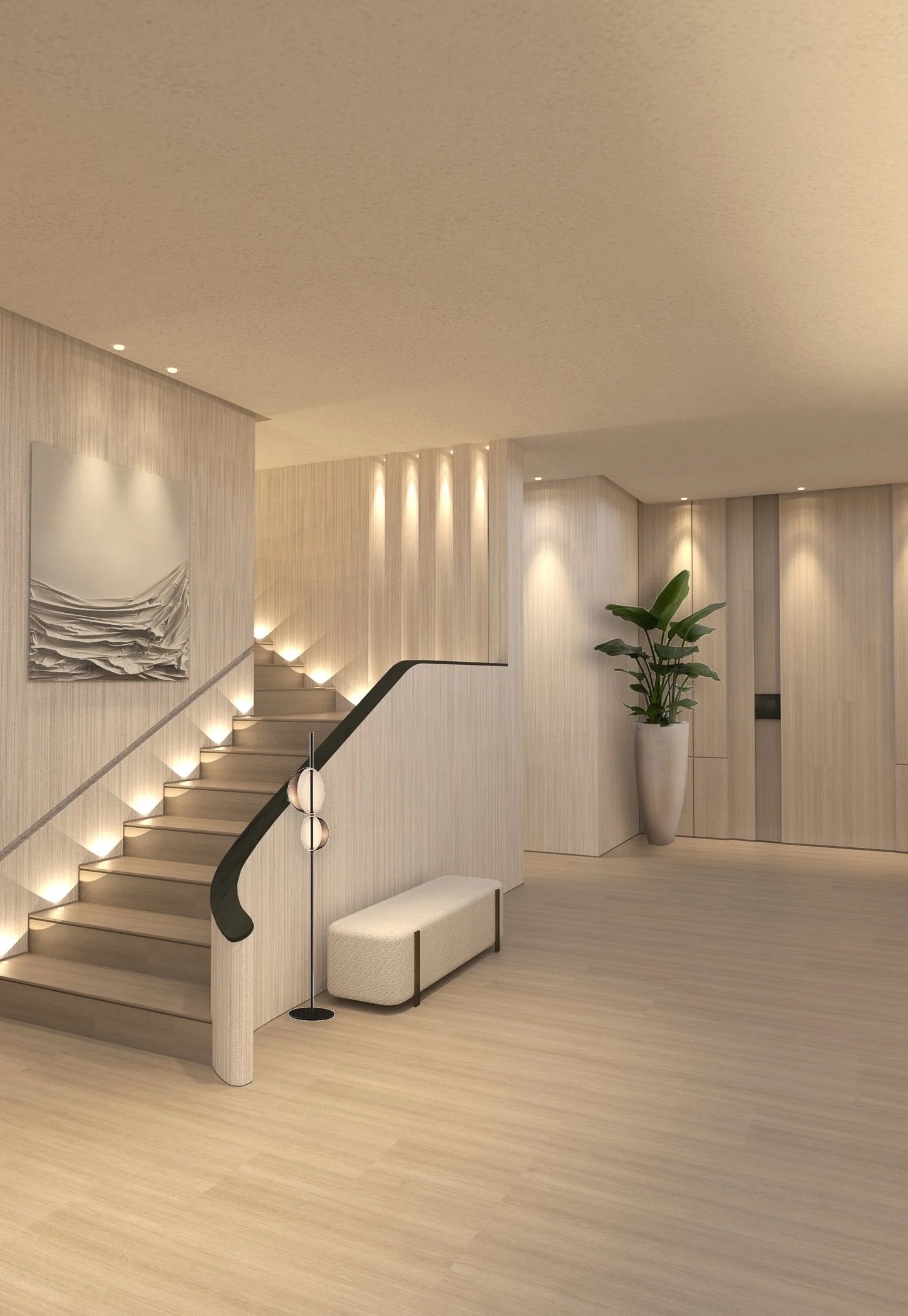 The entry strikes immediately: a curved staircase, black-and-white stone underfoot, and textured walls that play with light. Inside, the space unfolds in contrasts — plush custom seating, graphic lines, and a lighting concept that sculpts rather than illuminates.