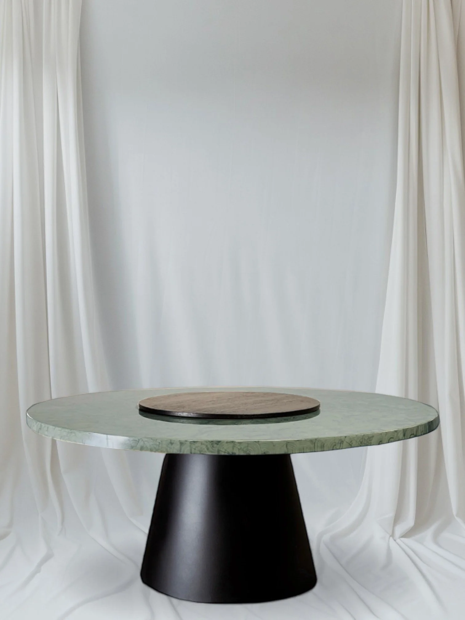 The table features a striking combination of textures— a lazy Susan crafted from oak veneer contrasts beautifully with the high-gloss shell technique. Together, they create a bold dialogue between natural warmth and polished refinement.